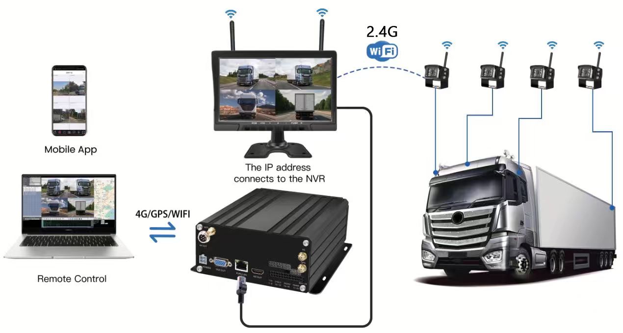 Cameră de vizualizare în cabină pentru monitorizarea șoferului AHDCarleader 10.1 inch 4CH Wireless HDD Mobile NVR System, un sistem NVR mobil de ultimă oră, conceput pentru gestionarea flotei. Sistemul utilizează 4 bucăți de camere IP fără fir care se împerechează cu un monitor cu fir de 10,1 inchi prin semnal de 2,4 GHz, apoi conectează monitorul și NVR-ul cu un conector RJ45. nu este nevoie de probleme de cablare extra, mai eficient pentru instalare și gestionarea flotei.