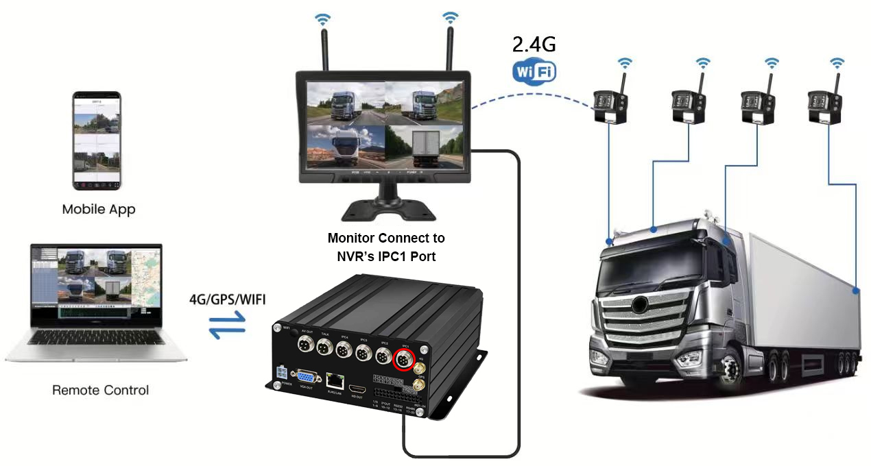 Intrări suplimentare pentru cameră IP cu fir de 3 canaleCarleader 10.1 inch 7CH Wireless HDD Mobile NVR System, un sistem mobil NVR wireless de ultimă oră, care este conceput pentru gestionarea flotei. Sistemul folosește 4 bucăți de camere IP fără fir care se împerechează cu un monitor cu releu cu fir de 10,1 inchi prin semnal de 2,4 GHz, apoi conectează monitorul releului și portul IPC NVR prin conectorul de aviație 6PIN, acceptă și intrări suplimentare pentru camere IP cu fir de 3CH.