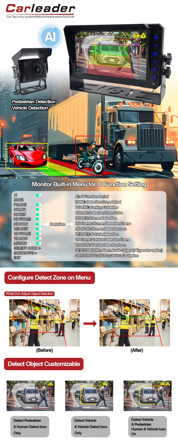 Cameră de vizualizare în cabină pentru monitorizarea șoferului AHDCarleader 7 inch AI BSD Blind Spot Detection Monitoring System Support AI Calibration este proiectat cu algoritmi AI avansati de înaltă precizie și meniu ușor de utilizat. Acest sistem de camere AI oferă șoferilor avertismente dinamice de înaltă precizie pentru pietoni și vehicule pentru orice vreme, reducând efectiv riscul accidentelor de circulație. Sistemul de camere de monitorizare AI este potrivit pentru mașini private, flote comerciale și vehicule speciale. Sistemul AI al flotei are integrare și compatibilitate puternice, durabilitate și capacități de monitorizare în timp real.