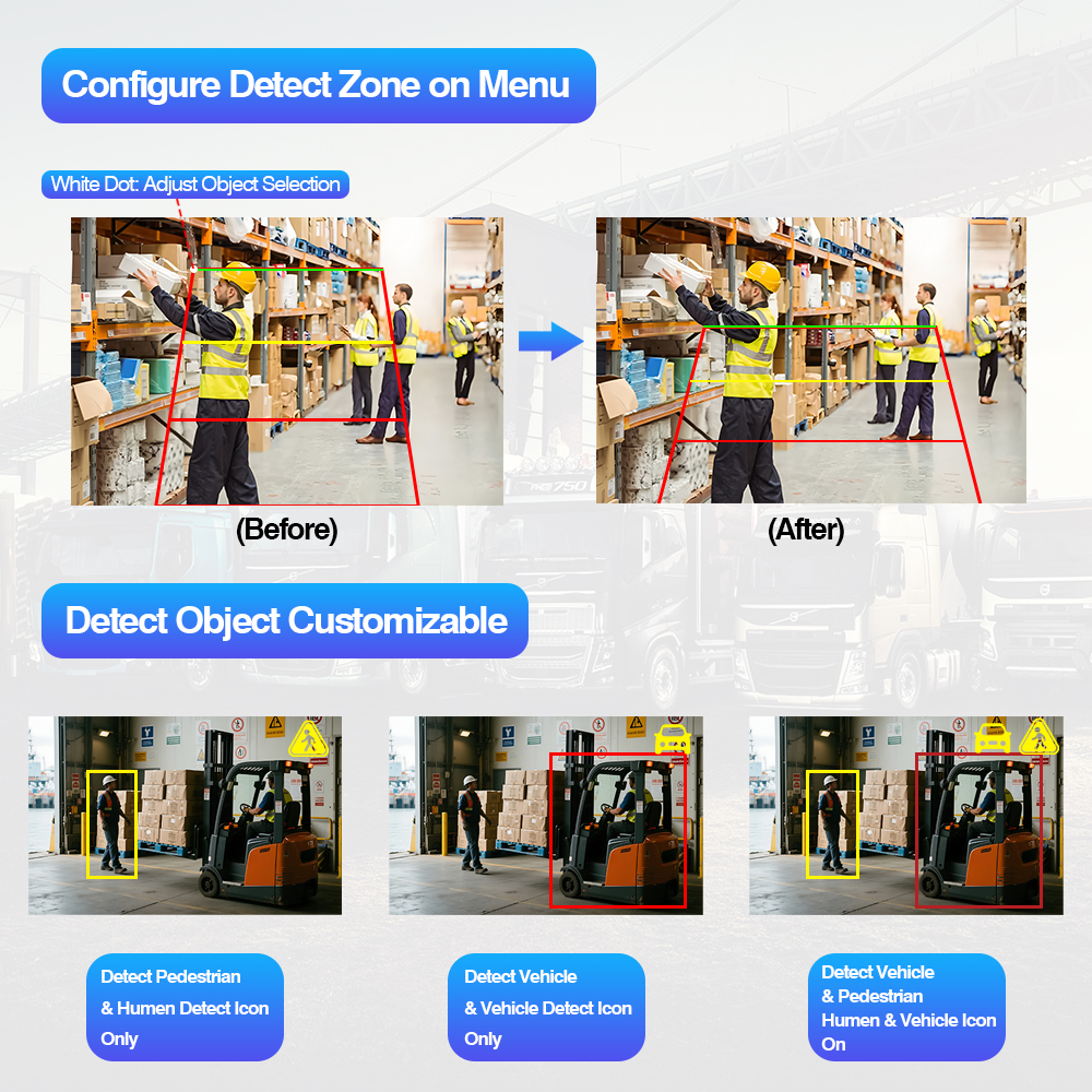 AI Blind Spot Detection Camera cu vedere din spate Lumină de avertizare pentru schimbarea culorii încorporatăSistemul de camere de detectare a unghiului mort AI Lumina de avertizare pentru schimbarea culorii încorporată este un set inteligent de siguranță pentru vehicul care include o cameră BSD AI și un monitor AI care acceptă setarea de calibrare AI, permit utilizatorului să modifice setarea AI, cum ar fi reglarea dimensiunii zonei de detectare, tipul de alarmă audio selectabil, activarea/dezactivarea detectării pietonilor, activarea/dezactivarea detectării vehiculului și orice altă setare de calibrare.