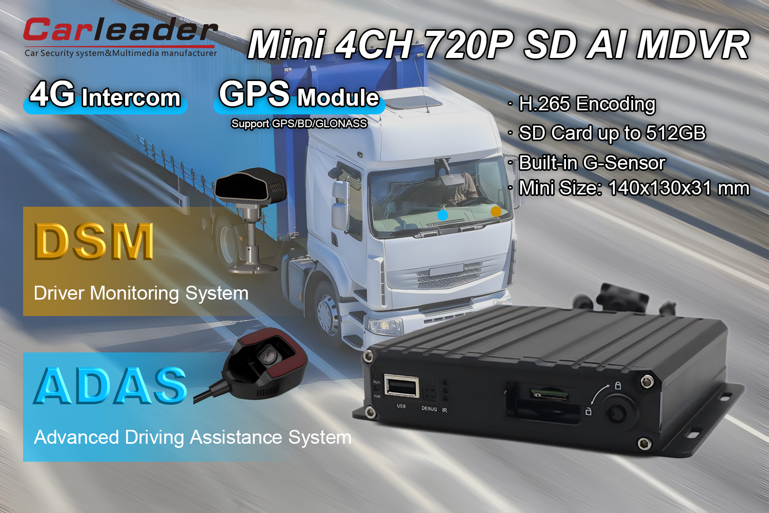 CarleaderDVR mobil inteligent 4CH AI cu DSM și cameră ADAS, un 4 canale compact și performantȘi mdvr(inregistrator video digital mobil) conceput pentru aplicații moderne de supraveghere și siguranță a vehiculelor. Combinând capabilități avansate de inteligență artificială cu un design hardware robust, acest dispozitiv oferă monitorizare, înregistrare și analiză inteligentă a imaginilor în timp real, într-un factor de formă miniaturizat.