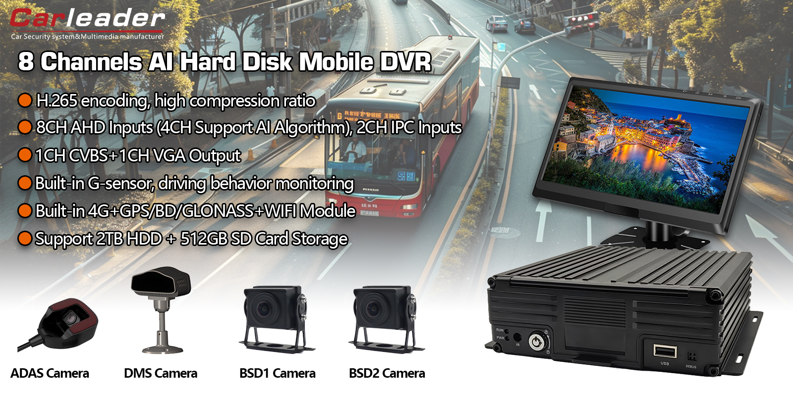 Carleader8CH AI HDD Mobile DVR Suport ADAS+DMS+BSDeste soluția perfectă pentru flote comerciale, transport public, logistică și vehicule speciale care necesită: