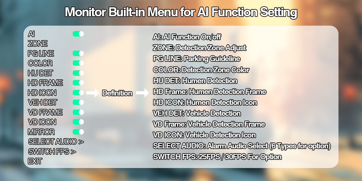 CarleaderSistemul de monitorizare de detectare a punctelor moarte AI BSD de 7 inch acceptă calibrarea AI, o soluție de cameră AI care acceptă detectarea pietonilor, detectarea vehiculului, crește semnificativ siguranța în timpul conducerii, monitor cu meniu de calibrare AI încorporat, permite utilizatorului să regleze zona de detectare, activarea/dezactivarea zonei de detectare a afișajului color, tipul de alarmă audio, afișarea pictogramelor vehiculului și pietonului, selectarea obiectelor de detectare etc.