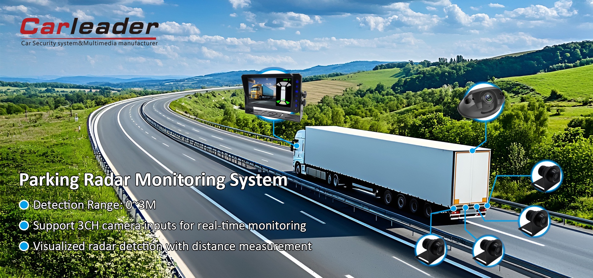 Sistemul de cameră inversă AHD cu senzor radar de parcare Carleader are un monitor LCD reglabil de 7 inchi, care are rezoluție înaltă de 1024 x RGB x 600 cu setări personalizate (luminozitate, contrast, croma) și moduri multiple de afișare (FULL/DOWN). Suportă imagini în oglindă/non-oglindă și 14 instrucțiuni specifice vehiculului.