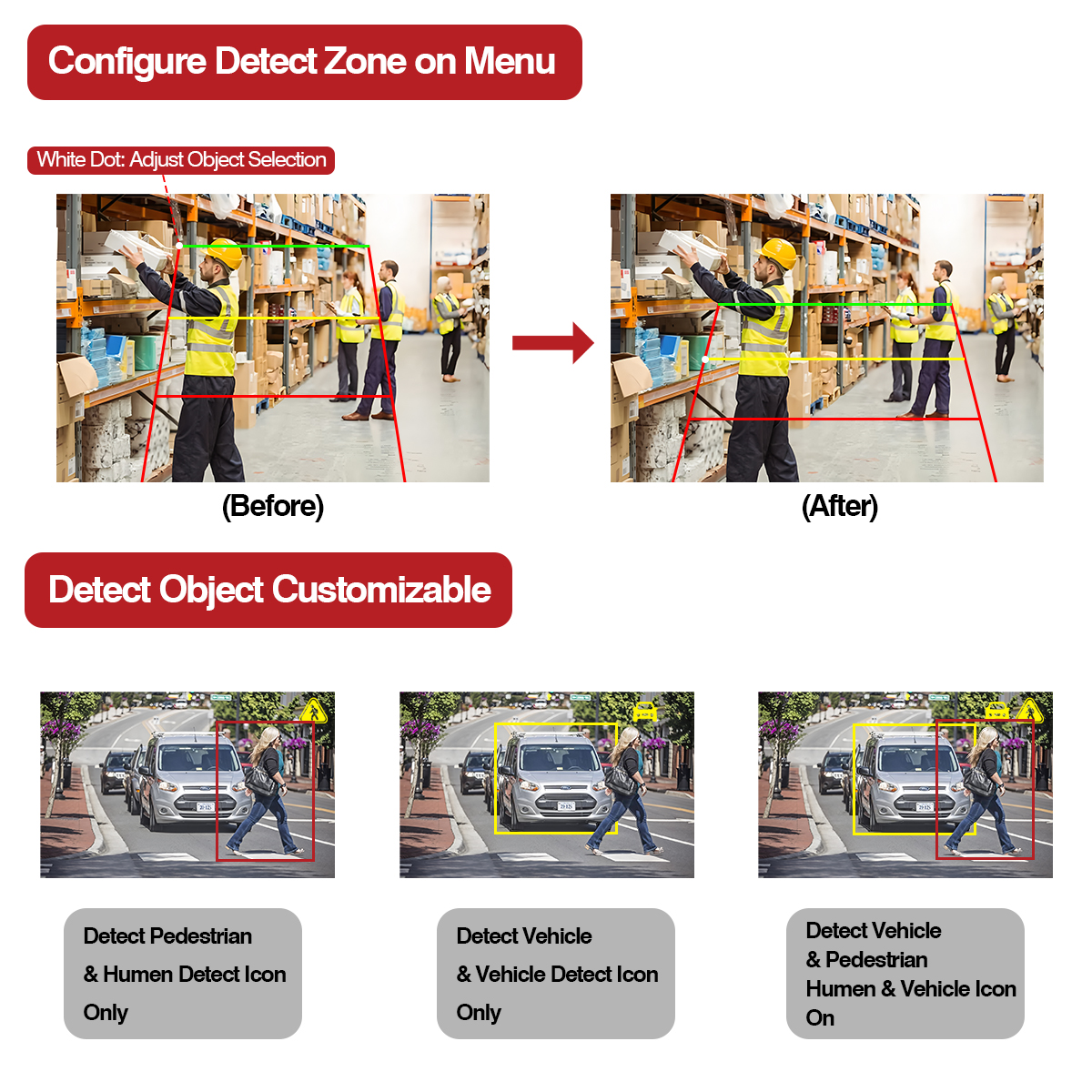 Această cameră AI cu funcție de lumină de avertizare încorporată, culoarea luminii se va schimba în culoarea corespunzătoare atunci când obiectul de detectare intră în diferite zone de detectare (roșu, galben, verde). De asemenea, se integrează cu alarmă la alarmă din jurul pietonului și al vehiculului care se apropie de vehiculul tău.